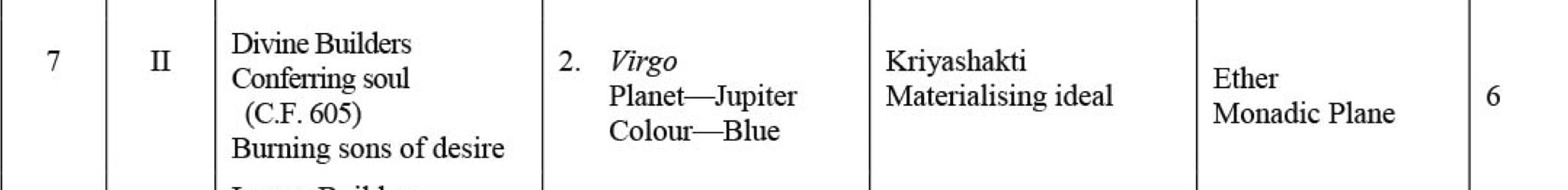 Fundamental collaborators: such is Virgo, the co-creating Mother, the zodiacal Muse of the second creative Hierarchyof the Divine Builders materializing the Ideal, the Burning Sons of the solar Logos’ Desire to incarnate, highest Devassupporting the Celestial Men or Gods of the solar Olympus of Zeus-Jupiter, the solar Love-Wisdom.