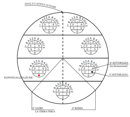 «[…] the method of individualisation through the coming in of the Lords of the Flame… is the prime method in this solar system; whatever methods may be pursued in the varying schemes and chains*, this—at the middle stage—is the universal rule. Karmic conditions having to do with a planetary Logos may effect modifications, and bring into action manasadevas whose activity may not be the same in working detail, but the results are ever similar, and the divine Egos in their causal bodies have analogous instruments to work through…»